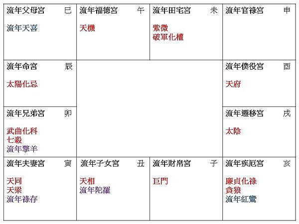 此時流年夫妻宮暗合流年疾厄宮,而流年疾厄宮有「流年紅鸞星」。如果是單身的人,就看流年夫妻宮疊到本命盤的哪個宮位,或是看飛化,看哪個宮位造成流年夫官線化祿,就可以知道對象可能來自哪裡,或誰介紹的。