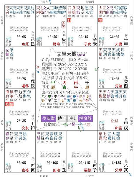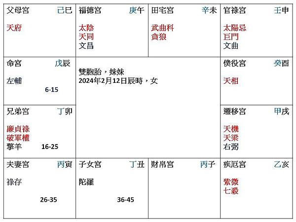 我隨機取一個2024年2月12日辰時生,女生,雙胞胎的姐姐,就是這一張命盤。