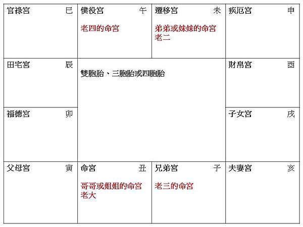 因為要滿足上述四個條件,所以,雙胞胎弟弟或妹妹的命宮,則是哥哥或姐姐的遷移宮,如果是三胞胎或四胞胎,則分別是哥哥或姐姐的兄弟宮,還有僕役宮為命宮。這樣才會出現小時候長相很像,家世背景一樣,但越長大越不像,命運也越來越不一樣。